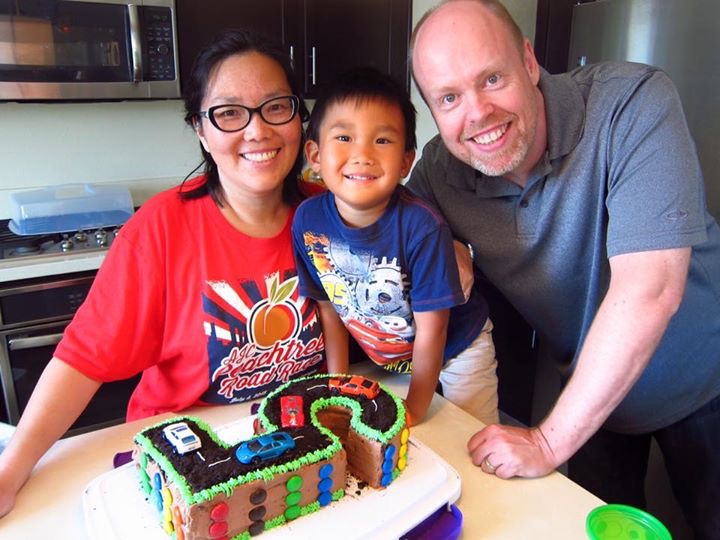 Joel 和凱玲與小壽星Isaac在媽媽和阿姨做得漂亮蛋糕前攝影留念